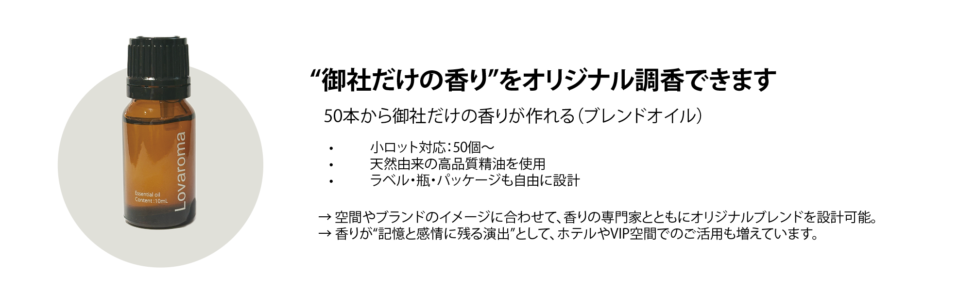 A. ブランドや空間のイメージに合わせて、専任のアロマデザイナーが調合いたします。既存の精油からの選択も可能ですし、完全オリジナルのブレンドも承ります。ご予算に合わせた制作も可能です。
