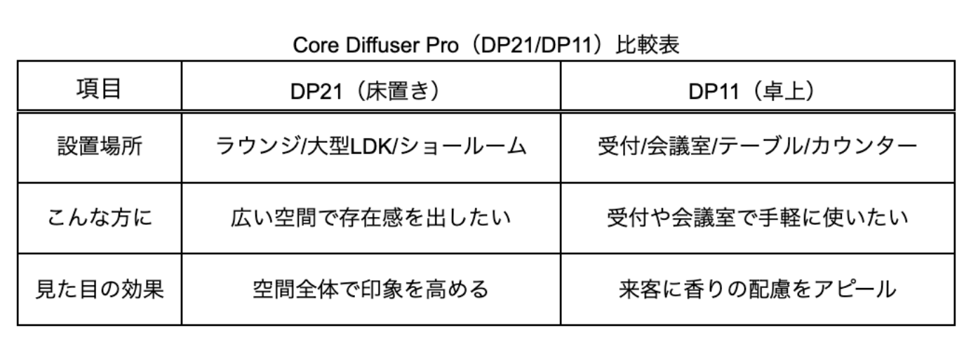 香りは3段階で調整でき、時間帯や利用シーンに合わせて最適な状態を保てます。床置きのDP21と卓上のDP11、どちらのモデルも空間の用途や目的に合わせて選択してください。